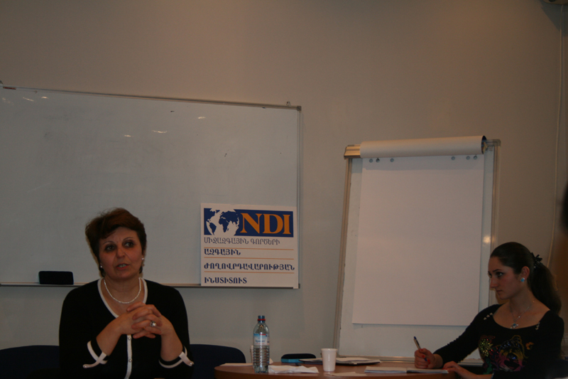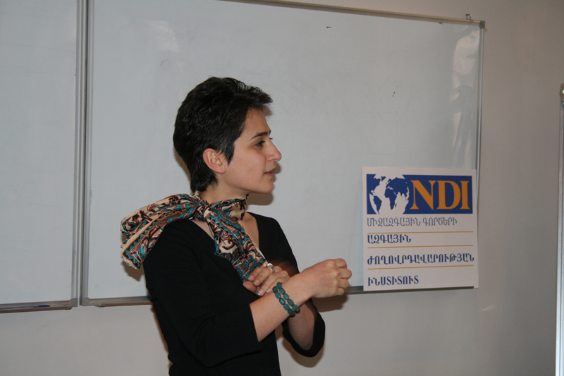 Օրվա դասը վարում էին Հասարակայնության հետ կապերի հայաստանյան ասոցիացիայի փոխտնօրեն Անուշ Բեգլոյանը և "Ազգային ժողովրդավարական միություն" կուսակցության բյուրոյի անդամ Անահիտ Աղոյանը: Բանախոսները մասնակիցներին ներկայացրեցին Հայաստանի պետական կառույցներում կանանց ներկայացվածության ներկայիս իրավիճակը, կանանց մասնակցության մեխանիզմները, մասնակիցների հետ կատարեցին կին թեկնածուների առաջընթացին նպաստող ճանապարհների վերլուծություն: Օրը հագեցած էր նաև խմբային աշխատանքներով: